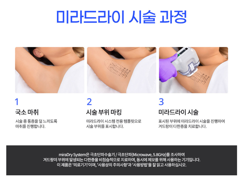 미라드라이는 땀이 많은 체질이라도 겨드랑이 국소 다한증이라면 도움이 될 수 있습니다. 다만 땀을 완전히 차단하는 시술은 아니며 효과와 유지 양상은 개인차가 있습니다. 충분한 상담 후 본인 상태에 맞는 방향을 선택하는 것이 좋습니다. |
