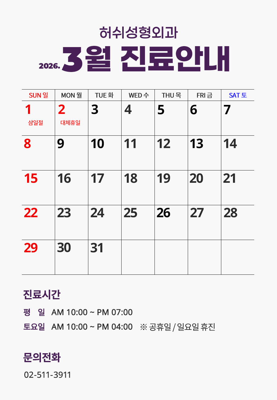 [허쉬성형외과] 2026년 3월 진료일 안내 2026-02-24 hit.281 |